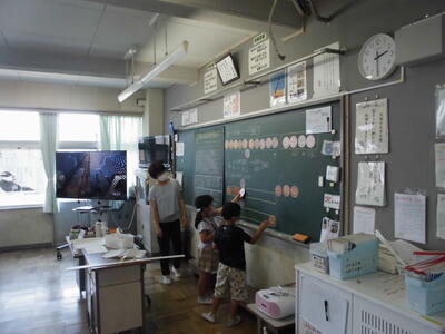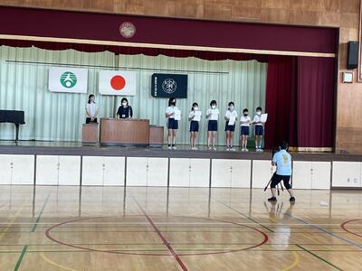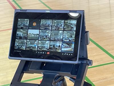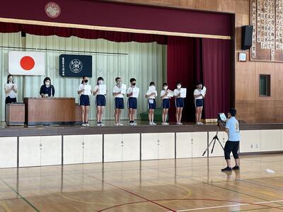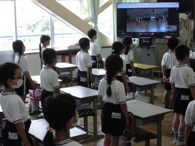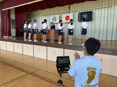 今日は体育朝会。先日行われた、市内陸上競技大会の表彰を行いました。感染症対策、熱中症予防のため、体育館での表彰場面を各教室でリモートで視聴しました。