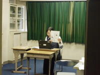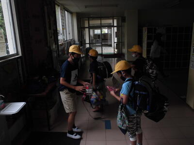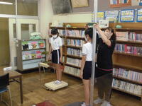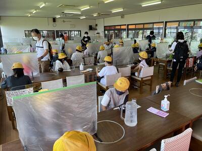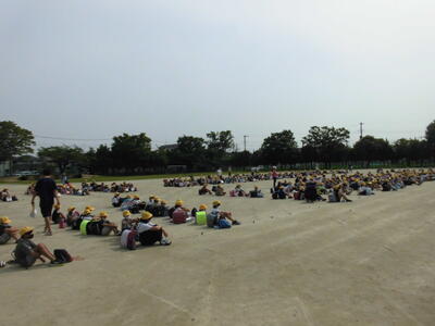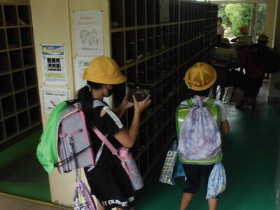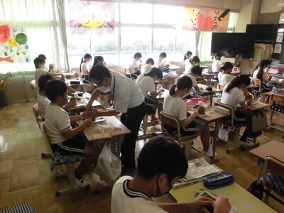 ( ↓ 暑さ対策で児童は半分に別れて、冷房の効いた図書室での待機と入れ替わります。)