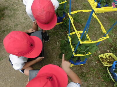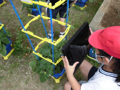 一年生の生活科の授業では、アサガオを育てて観察します。一人一台のタブレットを活用しています。