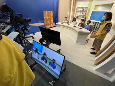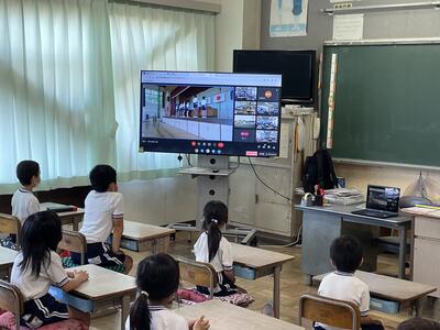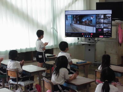 ( ↓ 2年生の発表は、リモートで教室の児童も見ています。)