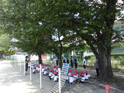 ( ↓ 一年生の交通安全教室です。暑さを避けるため、木陰で話を聞いています。)