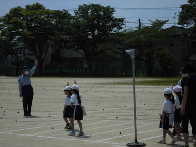 ( ↓ 4年生の体育です。リレーのバトンパスの練習をしています。声にあわせてバトンを受け取ります。)
