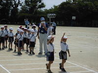 ( ↓ 運動委員さんを中心に、健康観察や準備体操をおこないます。)
