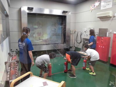 ( ↓ 火災の際の消火器の使い方の説明を聞いて、消火体験をしてみます。)