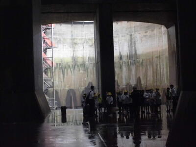 ( ↓ 水を貯める立坑を見学しています。壁の色が変わっている所まで水が来ると聞いて驚いています。)