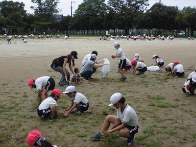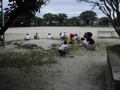 一学期に1・2・3年生が植えた畑のサツマイモも元気に育ってきています。先日、先生たちでサツマイモのツル返しをおこないました。(写真は6日の放課後の先生たちの作業の様子です。)
