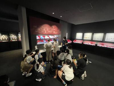 ( ↓ パネルや模型を見ながら、ガイドさんの説明を聞いています。)