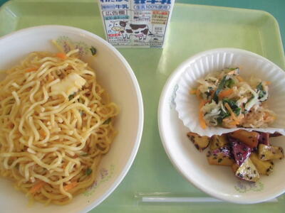 29日の給食は、キムチ焼きそば、牛乳、大学芋、切り干し大根のサラダ、でした。