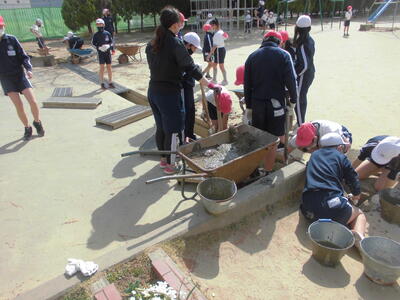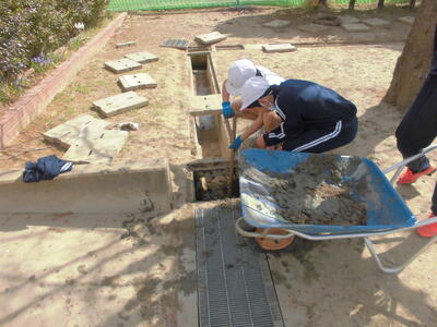 (6年間過ごした学校のために、修繕や美化活動をおこなっています。下の写真は、校庭の側溝の泥をさらっているところです。)