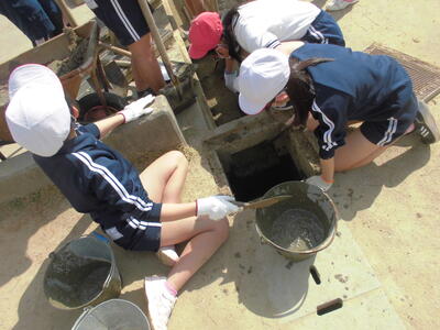 ( ↓ 6年生が、プールの底の泥をすくったり、汚れをこすり落としたりしてくれています。)