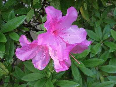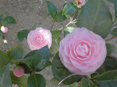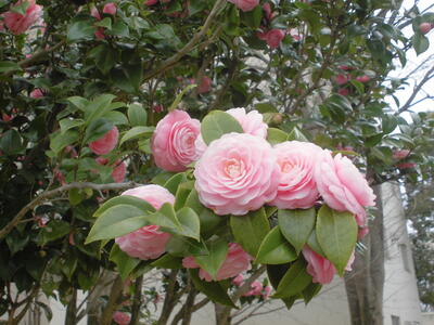 ( ↓ 学校に咲いているオトメツバキ。体育館横の木に、ピンクの花がきれいに咲いています。)