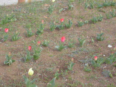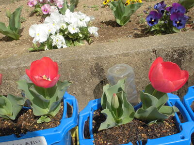 教室(ベランダ)の牛乳パックのミニ花壇で育ててきた花の芽を花壇に植え替えました。