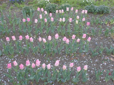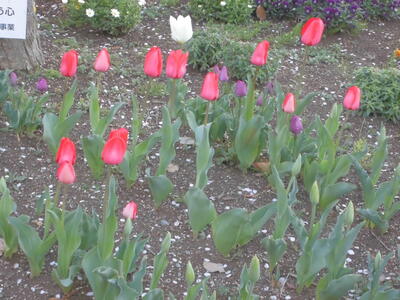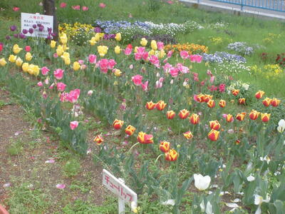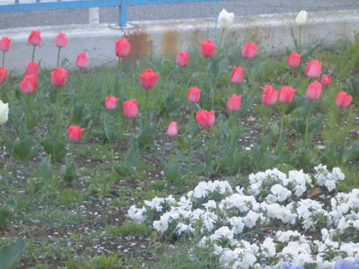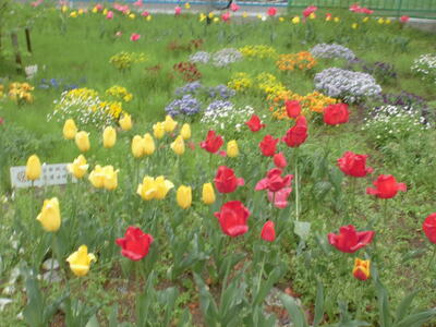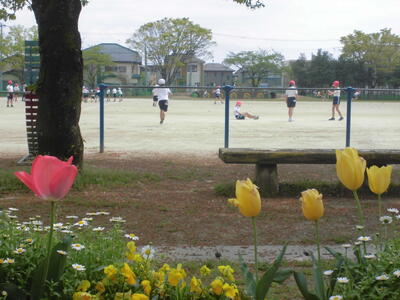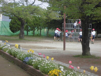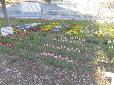 今日は日曜日で学校はお休みです。学校の花壇の花もきれいに咲いています。