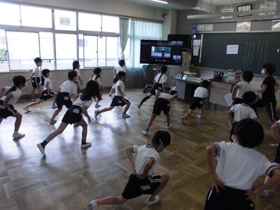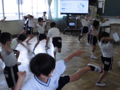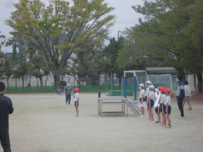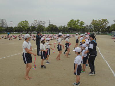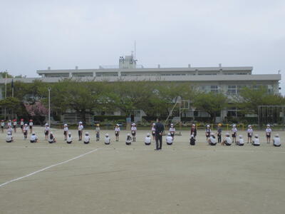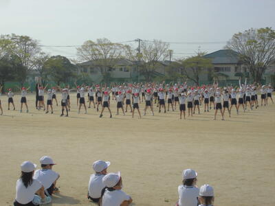 小渕小の朝は、一(いち)運動。子供たちが外に出て、自主的に運動する時間です。昨日の朝は雨で校庭が使えなかったので、6年生が卒業してから、始めて2~6年生だけの一運動です。