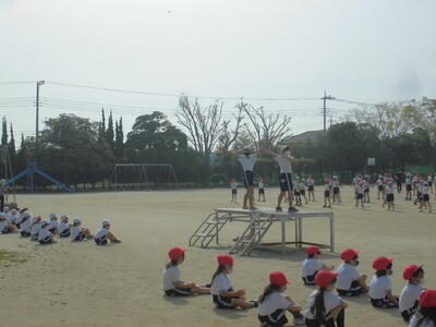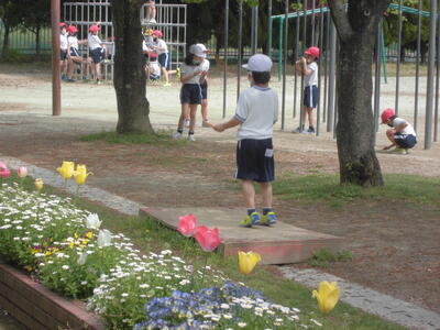校庭に、先日、おやじの会の方が作成してくださった、新しいジャンピングボードが置かれています。休み時間には、子供たちが大喜びで、その上に乗ったり、縄跳びをしたりしています。