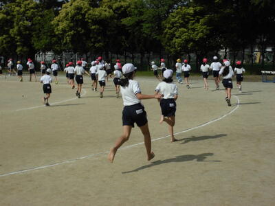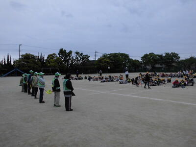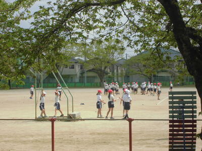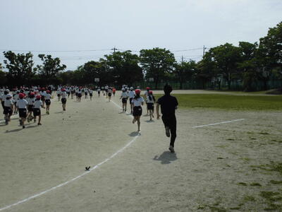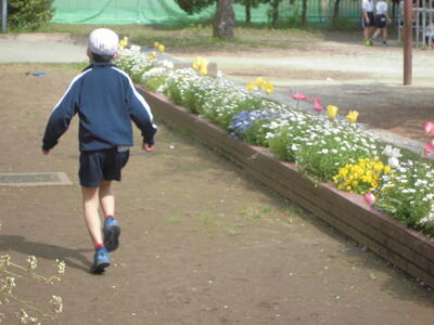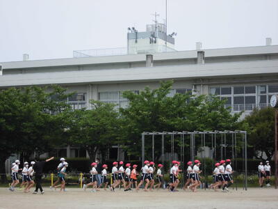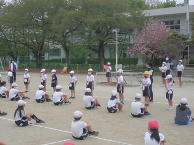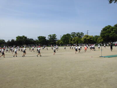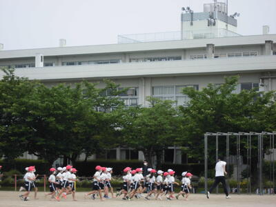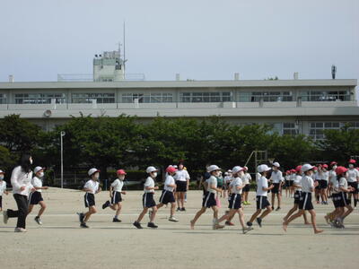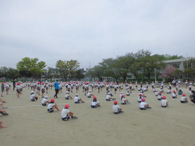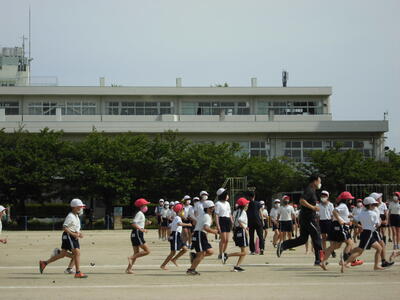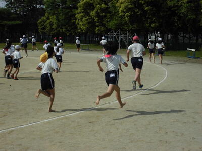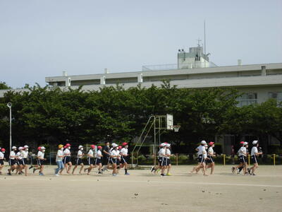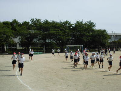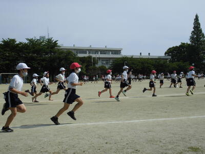 本日の朝は、さわやかタイム。全校で運動する時間です。子供たちは校庭に出て、元気に校庭を走りました。