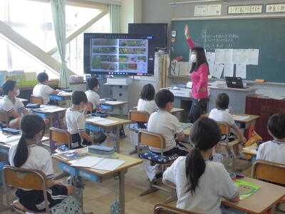 二年生が、生活科の学習で、一人一台のタブレット型パソコンを利用しています。