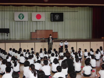 式の後に、本をたくさん読んだ「本いっぱい」、校庭をたくさん走った「汗いっぱい」の表彰がありました。