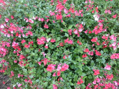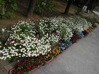 5月に、校長先生と校務員さんが植えた、正門の花壇の花が咲き始めました。