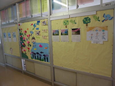 ( ↓ 卒業を祝う廊下の掲示。在校生が心を込めて作りました。)