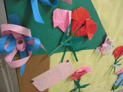 ( ↓ 6年生を送る会で、5年生が発表に使った色画用紙。7色の虹をあらわしたメッセージカードとなっています。)