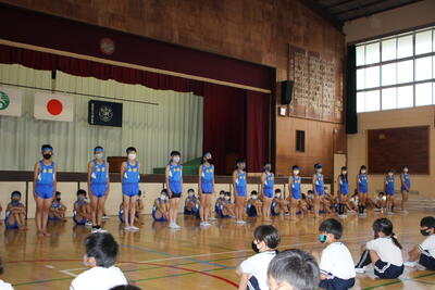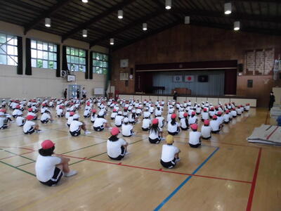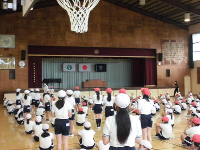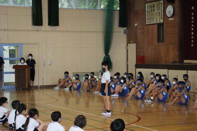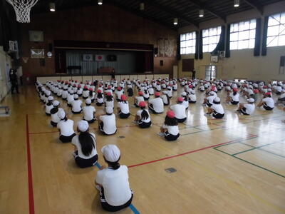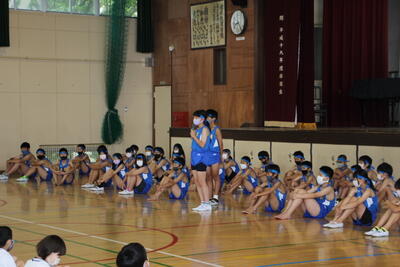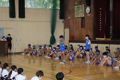 本日は、あさっての陸上大会に向けての壮行会がありました。雨天のため、体育館でおこないました。