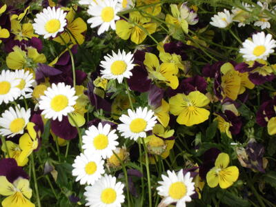 ヒマワリ・マリーゴールド・コスモス・ヒャクニチソウの種を育て、芽が出てきたところで花壇に移し替えています。