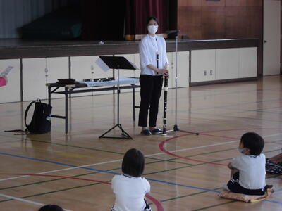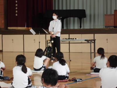 ( ↓ 体育館に集まって先生の話をしっかり聞いています。)