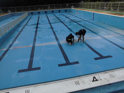 ( ↓ 5年生がプールの壁面や、プールサイドをきれいに磨いてくれています。)