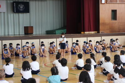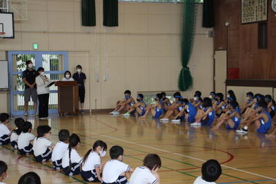 本日の朝は、体育朝会。プール開き集会をおこないました。