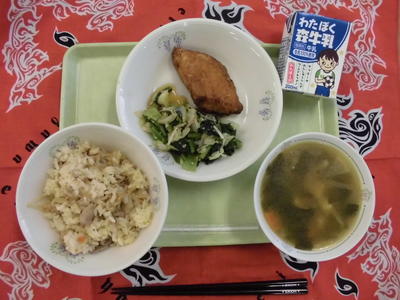 17日は「食育の日」献立で、しょい飯(三重県の郷土料理。しょいは方言でしょうゆのことです。)、牛乳、竹輪の二色揚げ、切り干し大根のあえもの、あおさ(三重県の特産物)のみそ汁、です。