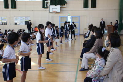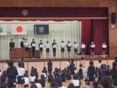 初めに持久走大会に向けて全校手取り組む「Run×3(ランランラン)」の表彰がありました。合計でたくさん走ったクラスが表彰され、代表児童がクラスの賞状を受け取りました。