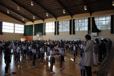 本日の朝は、体育朝会がありました。12月の体育朝会では、持久走大会関係の表彰がおこなわれます。
