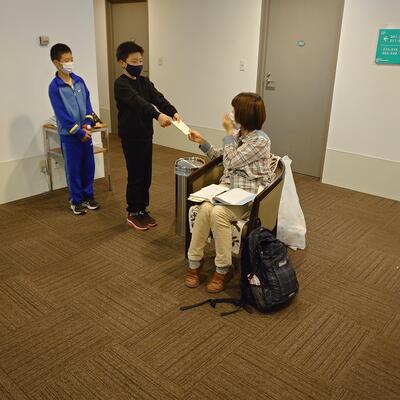 部屋のメンバーの体温と健康状態を記録した健康観察カードを、保健の先生に提出します。