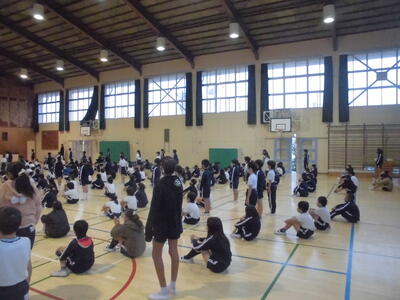 今朝の運動会・全体練習は、雨天のため、体育館でおこないました。開会式の流れを確認しました。