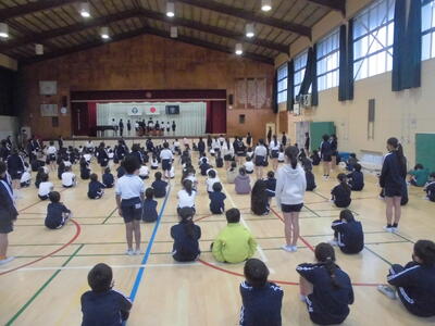 本日の昼休み、運動会の赤組・白組の応援団の児童が体育館に集まり、応援合戦に向けての打ち合わせをおこないました。役割を決めたり、応援グッズを受け取ったりしました。