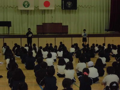 先日おこなわれた春日部市の「スーパー元気さわやか集会」に本校代表として参加した2名の6年生児童から報告がありました。