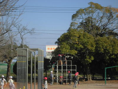 文字どおり、あそぞらの下で、子供たちは、ボール遊び、なわ跳び、追いかけっこ、鬼ごっこ、鉄棒、高跳びなどのびのびと遊んだり運動したりしています。