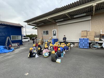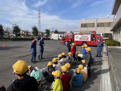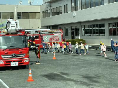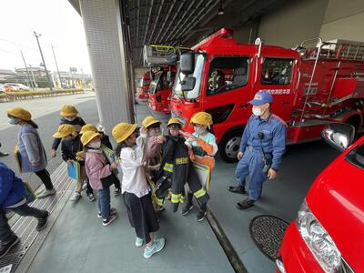11:00 帽子店での見学を終えたクラスが消防署につきました。先に消防署の見学を終えたクラスと入れ替わります。