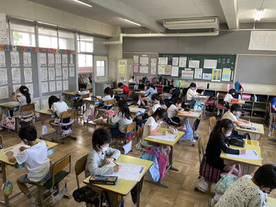 午後の一年生の授業です。先日の学校探検でわかったことなどを発表しています。