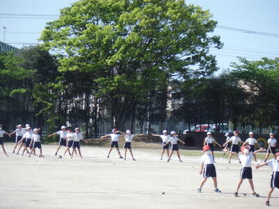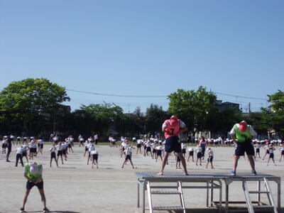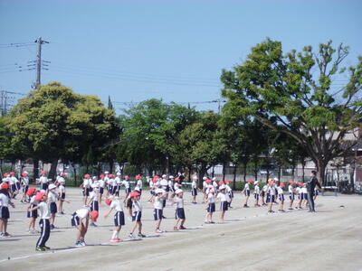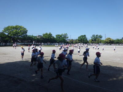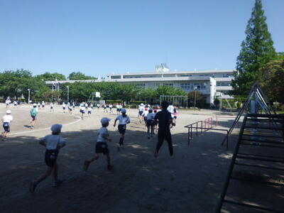 今日の朝は、さわやかタイム(全校で運動する時間)です。曇り空でしたが、雨は降っておらずに、校庭もかわいていたので、外で運動することができました。