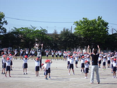 (ステージでは運動委員さんが手本を示しながら、全員でラジオ体操をおこないました。)