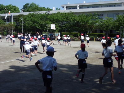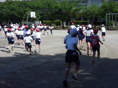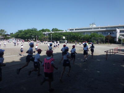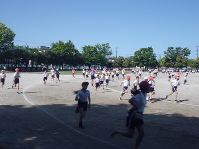 雲り空ですが、子供たちは元気に校庭を駆けました。