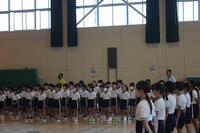 体育朝会では、代表児童が目標を発表したり、プール使用上のきまりを確認したりしました。
