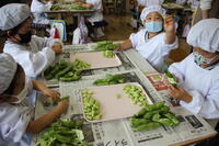 事前にそら豆の名前の由来やむき方などについて学習し、身支度をしっかり整えて行いました。