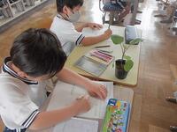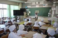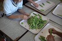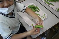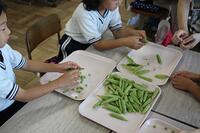 学校栄養士の先生に、グリンピースの話を聞き、2年生がさやむきをしました。