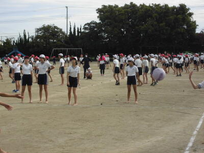 7:50 毎朝の一運動(いちうんどう)が始まっています。陸上大会は4年生以上ですが、1~3年生も朝の運動は元気に参加しています。