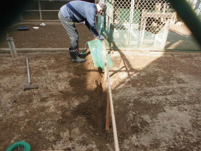 ( ↓ 土を入れて、地面をならします。)