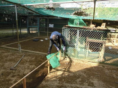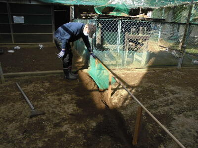 ( ↓ ウサギが掘った穴をうめたり、不安定になった柱を固定したりします。)