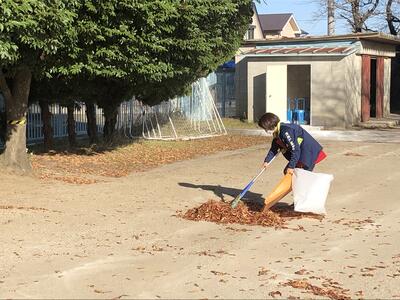 ( ↓ 前回は雨のため外で活動できなかった校庭のグループでしたが、今日は一生懸命に落ち葉などを集めていました。)